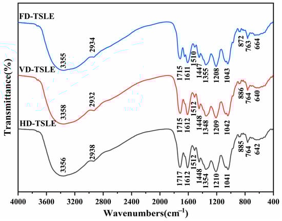 HD-TSLE, VD-TSLE and FD-TSLE powders (1 mg) were evenly mixed with dried KBr (200 mg), ground, pressed into thin tablets, and scanned in a waveband range between 4000 and 400 cm−1 using a Fourier transform infrared spectrometer (IS50, Thermo Fisher Scientific, Waltham, MA, USA).