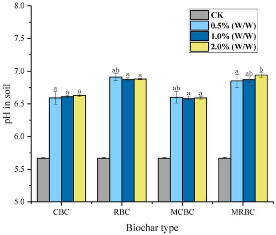 The pH of group CK measured by a potentiometer is 5.67, and the soil pH of each biochar addition treatment is shown in Figure 1. In this experiment, the application of biochar to soil samples can improve soil acidity. RBC and MRBC (rice-straw biochar) significantly increased the soil pH value compared to CBC and MCBC (corn-straw biochar) at each addition level, increasing the soil pH value from 5.67 to 6.87–6.94. Compared to corn-stalk biochar, the increase from 5.67 to 6.58–6.63 was 0.24–0.36 units.