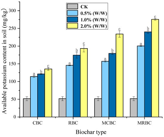 The obtained K+ formula is y = 0.0112x − 3.8092, R2 = 0.9998. After calculation using the formula, the content of soil available potassium determined is shown in Figure 2. As can be seen from the figure, compared to the control group, CK, the soil available potassium content of all treated samples with added biochar increased by more than 200%, and the available potassium content of the CK group was 51.73 mg/kg. The highest available potassium content in soil samples treated with rice-straw Mg-modified biochar MRBC was 275.62 mg/kg. Through a horizontal comparison, it was found that the effect of four kinds of biochar on increasing the content of available potassium was significantly different under the same addition amount. At each addition level, the effect of increasing the soil available potassium content was in the order of MRBC, MCBC, RBC and CBC from highest to lowest. Through longitudinal comparison, it was found that the content of available potassium increased with the increase in the addition amount of each kind of biochar.