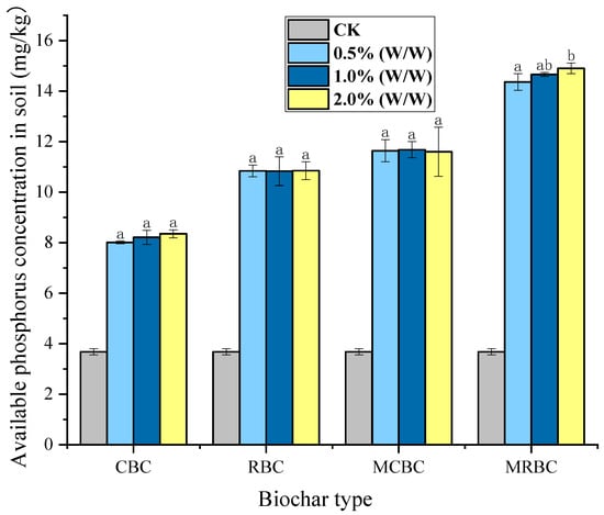 Available phosphorus content in soil samples under different treatments. Note: The bars in the graphs show the mean ± standard deviation of the indicators; lowercase letters indicate the differences in the effects of different Mg-modified biochar on soil chemical properties (p < 0.05), as below.