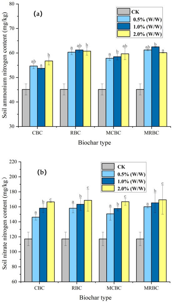 It is evident from the chart analysis that the addition of biochar to soil resulted in a noticeable rise in both ammonium nitrogen and nitrate-nitrogen concentrations. The difference between the treatments and the CK group was significant (p < 0.05). In terms of the change in the content of soil ammonium nitrogen, there was no correlation or regularity between the amount of biochar added and the content of ammonium nitrogen. There was even a situation in which the ammonium nitrogen content of soil samples treated with CBC with 1% (w/w) addition was lower than that of the soil samples treated with 0.5% (w/w) and 2% (w/w) CBC. However, the ammonium nitrogen content of the soil samples treated with RBC with 1% (w/w) addition was higher than that of the 0.5% (w/w) and 2% (w/w) treatments. This situation also appears in the MCBC, MRBC and other treatments, so there is no linear relationship between the amount of biochar added and the content of ammonium nitrogen. In contrast, in each biochar treatment, the nitrate-nitrogen content increased with the increase in biochar addition, and the increase of 1% (w/w) was the largest.