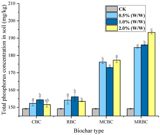 The overall phosphorus concentration of the CK group was 149.2 mg/kg. Other test results are shown in Figure 5. The total phosphorus content in the soil treated with unmodified biochar CBC and RB basically showed no significant increase, and the difference compared to the control CK was only 2.5% and 4%. The total phosphorus content in the soil samples treated with magnesium-modified biochar MCBC and MRBC increased by 17.4% and 26.2%, respectively. However, a pattern between the amount of addition and the increase in total phosphorus could not be obtained. Even in the MCBC treatment, the total phosphorus content of the samples with 1% (w/w) addition was lower than that of the treatment with 0.5% (w/w) addition, and, therefore, it did not reach a statistically significant level.