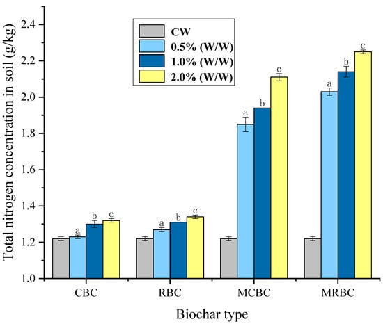 Total nitrogen nutrient content across different addition amounts of biochar treatment. Note: The bars in the graphs show the mean ± standard deviation of the indicators; lowercase letters indicate the differences in the effects of different Mg-modified biochar on soil chemical properties (p < 0.05), as below.