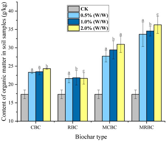 Content of organic matter in soil samples under different treatments. Note: The bars in the graphs show the mean ± standard deviation of the indicators; lowercase letters indicate the differences in the effects of different Mg-modified biochar on soil chemical properties (p < 0.05), as below.