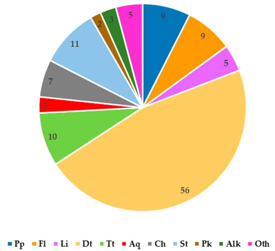 Number of secondary metabolites from various groups reported in C. trichotomum. Pp—phenylpropanoids; Fl—flavonoids; Li—lignans, Dt—diterpenoids, Tt—triterpenoids, Aq—anthraquinones; Ch—cyclohexylethanoids; St—steroids. Pk—polyketones; Alk—alkaloid; Oth—other compounds.
