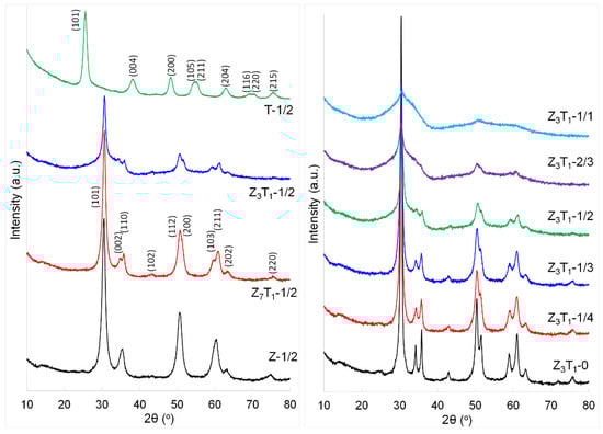 Since the purposes of this work are to achieve a higher specific surface area and to focus on the Zr-Ti solid solutions while the powders possess a tetragonal structure, two series of samples are investigated, as shown in