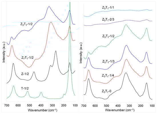 Figure 2 shows the Raman spectra of two series of powders after leaching silica. The zirconia (Z-1/2) displays well-defined Raman peaks, including 148, 270, 314, 461 and 642 cm