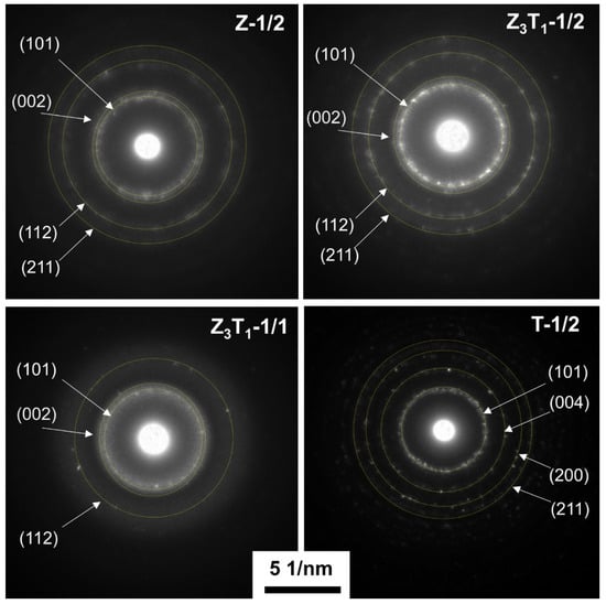 Figure 6 shows the selected area diffraction rings generated from the selected aperture area, which includes many nano-sized grains with different crystal orientations. The patterns belong to the tetragonal crystalline structure. The Z-1/2 and Z