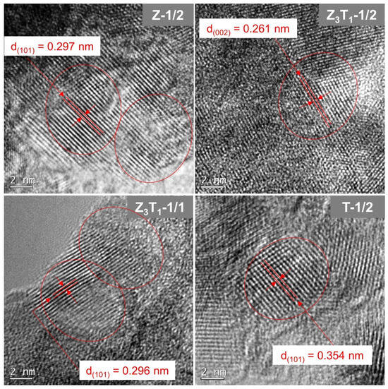 Figure 7 demonstrate the lattice structures of the crystal. The d-spacings of lattice planes based on the HRTEM estimation are in good consistency with XRD data, with a value discrepancy of <2%. The results confirm the full crystallization of the materials for most samples, with crystallite grains exhibiting a similar scale to the primary particles. Although the TEM images and SAED patterns show the specimen features of small areas whereas the XRD results reflect the characteristics of the bulk materials, the d-spacing measurements by TEM match well with the XRD results. As a result, both techniques are used complementarily to better understand the microstructure and overall structure of the materials.