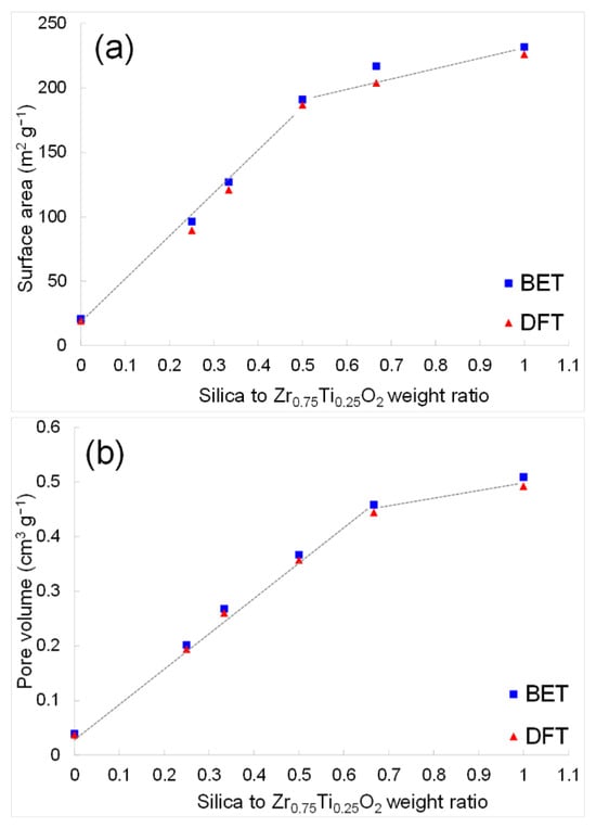 Figure 9a). With a further increase to the weight ratio of 0.5 to 1.0, the specific surface area still increases gradually, but at a slower pace compared to samples having less silica.