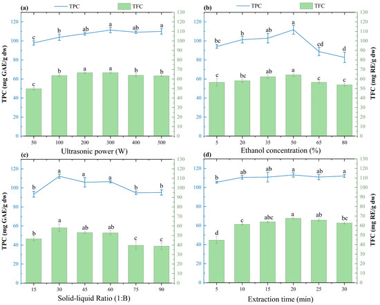 Influences of extraction factors on the yields of TPC and TFC from L. similis flowers. (a) Ultrasonic power, (b) ethanol concentration, (c) SLR, and (d) extraction time. Lowercase letters indicate significant differences among tested levels (p < 0.05).