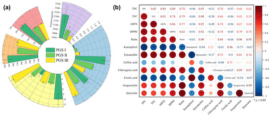 The quantitative results of eight phenolic compounds from the L. similis flower at three harvest stages (a), and the correlation analysis between phenolic compounds and antioxidant activity (b). Data represent mean ± SEM, n = 3.