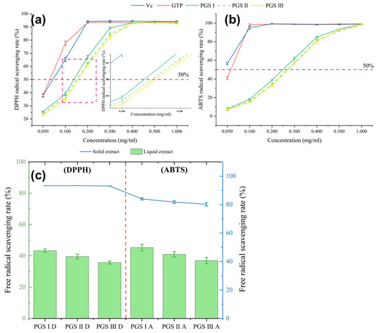 DPPH and ABTS radical scavenging ability have been extensively applied to assess the antioxidant ability of biological compounds in various plant species [63]. The present results suggest that the IC50 values of ABTS and DPPH scavenging activities of extracts at PGS I (0.248 mg/mL and 0.139 mg/mL, respectively) are higher than those at PGS II (0.269 mg/mL and 0.152 mg/mL, respectively) and PGS III (0.272 mg/mL and 0.158 mg/mL, respectively) (Figure 4a,b). This may be related to the differences in phenolic compounds contents and their composition at three harvest stages, which are shown in Table 3 and Figure 3. Moreover, the comparative analysis results of the antioxidant activity of extracts and dried samples show that the ABTS radical scavenging rates of solid extracts (over 80%) are significantly higher than those of liquid extracts (36.9–45.2%). The DPPH radical scavenging rate of liquid extracts can reach 43.3%, and the values of solid extracts were over 90% (Figure 4c). These results exhibit that the extracts and dried samples possess a strong antioxidant capacity, which is associated with antioxidative phenolic compounds.