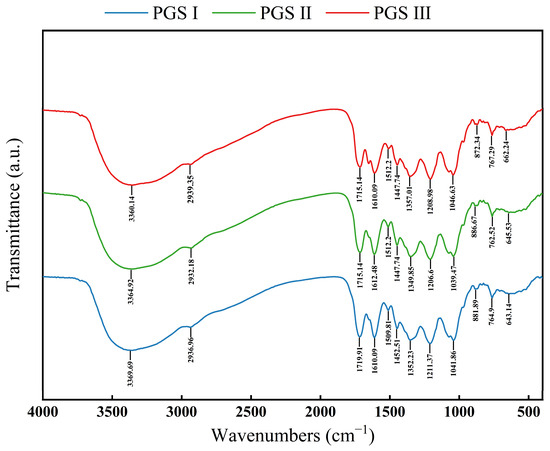 FTIR has been widely used to identify organic groups of plant phenolics in plant extracts, and provide some key information about the chemical valence structure characteristics of bioactive compounds. FTIR can also easily identify the stretching and bending vibrational bands of hydroxyl and carboxyl groups in an extract [64,65]. As shown in Figure 5, phenolic compounds from LSF at three harvest stages exhibit 11 similar characteristic absorption peaks, indicating the similar composition of phenolic components. Previous studies have indicated that the characteristic absorption peak of phenolic compounds in the collected optimum extracts were observed in the range of 3400–3200 cm−1, which were corrected to the combined stretching vibrations of hydroxyl groups [66,67]. The peaks near 2936 cm−1 represented the stretching vibrations of the aromatic C-H in the polyphenols extract [68], and near 1715 cm−1 and 1610 cm−1 for the vibration of the C=O structure and the extension of the benzene ring, respectively [69]. The peaks near 1350 cm−1, 1208 cm−1, and 1040 cm−1 correspond to the folding of -CH groups in the extract, the stretching of amino groups of C-N, and the vibration of C-C, respectively [69,70]. Moreover, the bands ranging from 769 to 659 cm−1 represented the out-of-plane bending vibration of O-H [71]. The present results indicate that the variation characteristics of FT-IR spectroscopy are consistent with the differences in phenolic compounds from LSF at three harvest stages.