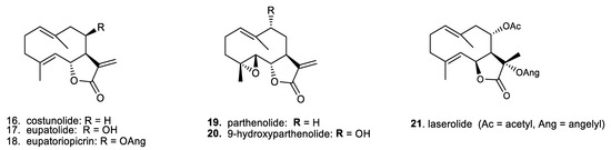 In addition, for a broader comparison of their biological effects, we also included a small series of germacranolides, which are the phylogenetic precursors of the primarily investigated guaianolides [6,12]. Overviews of the selected structural types of sesquiterpene lactones are presented in Figure 2 (for the guaianolides) and Figure 3 (for the germacranolides).