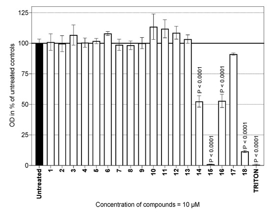 The viability of mouse peritoneal cells was determined using a colorimetric assay based on the cleavage of tetrazolium salt WST-1 by mitochondrial dehydrogenases in viable cells (Roche Diagnostics, Mannheim, Germany). The cells (1 × 106/mL) were cultured as described above. The viability of primary murine macrophages was tested in the presence of 10 µM of the respective test substance for 21 h. After the first 24 h of cultivation, WST-1 was added (10 µL), and the cells were kept in a Heraeus incubator at 37 °C for an additional 3 h. Triton X-100 (1%) was used as a common reference in the cytotoxicity assay. Optical density was evaluated at wavelengths of 450–690 nm.