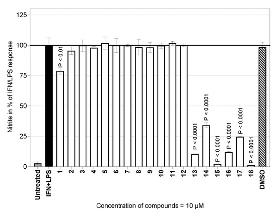 Inhibition of nitric oxide production (IC50) in the presence of compounds 1–21 in (LPS + IFN-γ)-activated mouse peritoneal cells. IC50 values were obtained by testing concentrations of 0.01–50.0 μM (micromole) for each substance.