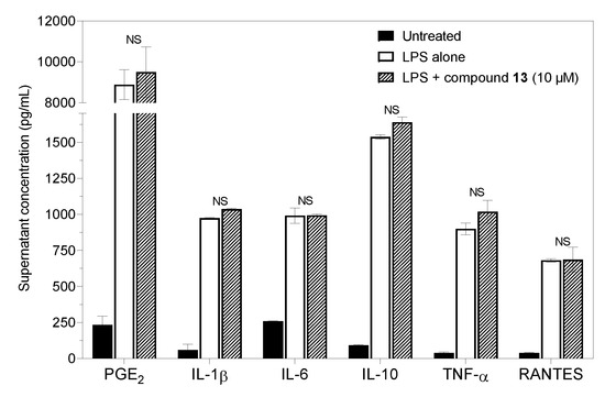 Effects of compound 13 (8-deoxylactucin) on the production of PGE2 and cytokines by murine peritoneal cells stimulated with LPS. The cells (2.0 × 106/mL) were cultured for 6 h or 21 h. Columns represent means with S.E.M. values indicated by error bars; NS—statistically non-significant difference.
