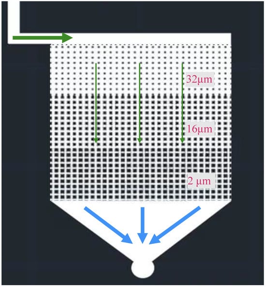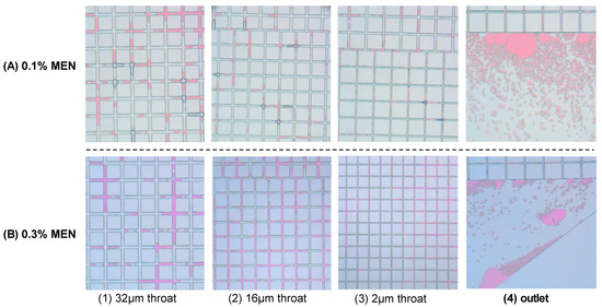 To compensate for this deficiency, this study applied a heterogeneous model to observe the small-size oil effect in different pore throat systems. Figure 2 shows the structure of the model, where the throats were etched at 32 μm, 16 μm, and 2 μm, respectively. The model was saturated with shale oil, and then the aqueous systems was injected into the model at certain speed. The fluid first flowed into the high-permeability zone (32 μm), then into the medium-permeability zone (16 μm), and the low-permeability zone (2 μm). The shape and flow behavior of oil droplets were observed and recorded using a high-speed digital camera.