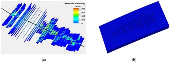 Geological modeling is based on learning from geophysical data, well logging data, seismic data, etc. [29]. The fracture model is established adapting from the geological model of Jimusaer shale formation in Junggar Basin, Xinjiang Oilfield. The fracture propagation and parameters were determined through history matching of pumping pressure curves [30]. A comprehensive sweet spot (CSS) method was used in the establishment of fracture model, dividing the sweet spot into the geological sweet spot (GSS) and the engineering sweet spot (ESS) [31,32]. Figure 3 shows the fracture model working as the initial model before injecting the aqueous solution.