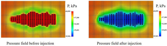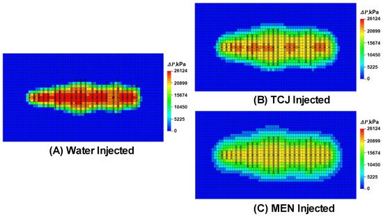 Numerical model of the fractured reservoirs with water, TCJ or MEN injected. The pressure field of the reservoir changed due to the fluid injection.