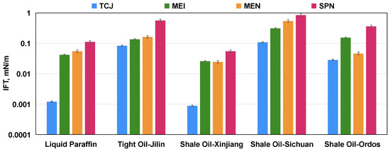 In the experiments, the IFTs of four types aqueous solutions with the liquid paraffin and the dead oil retrieved from Jilin, Xinjiang, Sichuan, and Ordos basins of China were measured. The concentration is 0.3 wt%, which is a common concentration used in the EOR operations of oilfields. As shown in Figure 5, all chemicals have a significant IFT reduction effect, reducing the IFT of the oil and water phases to below 1 mN/m. In all cases of different oil samples, the IFT of surfactant TCJ is the lowest. This agrees well with research reports [35,36,37]. Ultra-low IFT (<10−3 mN/m) was achieved by TCJ with one oil sample, which is beneficial for maximizing the oil-sweeping effect of chemical fluids. Micro-emulsion-based imbibition agent MEI and nanomaterial MEN could also reduce IFT to a low level. Compared with surfactant-based systems, the interfacial effect of SiO2-based nanoparticle SPN is not prominent.