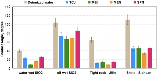 The wettability of water-wet SiO2 surface, oil-wet SiO2 surface and oil-wet rock surfaces were altered by different chemical systems and the equilibrium contact angles were measured. The result is shown in Figure 7, which indicates that the aqueous solutions tested have a wettability alteration effect. The chemicals turned the oil-wet surface into water-wet, and altered the hydrophilic surface to strong water-wet. This phenomenon is named bi-phasic wettability property [44]. The microscopic wetting of shale surface is complicated. The chemicals can alter the surface to more water-wet state regardless of whether the initial wettability is oil-wet or not. This is the advantage of those chemicals producing significant effect. Among the evaluated chemicals, the MEI and MEN exhibited the most significant wettability alteration effect. Micro-emulsions have high oil film removal efficiency, as the oil phase in the emulsions could increase the solubility of the crude oil.