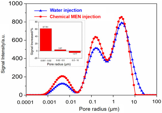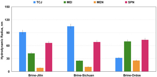 Hydrodynamic radii of the four aqueous solutions were measured in the brine prepared according to the recipe of formation produced water. The result in Figure 8 shows that salinity of the brine has an impact on the radius of the chemicals, especially the surfactant TCJ. Surfactant molecules form micelles and aggregates in the aqueous phase, thereby increasing the radius of the system. Nanoparticles also have the tendency to aggregates in order to lower the surface energy [46]. The size of MEN is the smallest, with an initial radius of approximately 10 nm. Its core–shell structure (oil phase as core, surfactant as shell), with hydrophilic groups arranged outward, avoids molecular aggregation.