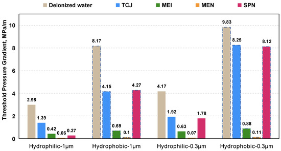It is believed that a minimum pressure gradient is required before the liquid begins to flow in a porous medium [27], which is commonly referred to as the threshold pressure gradient or starting pressure gradient. In shale and tight formations, the more difficult the fluid flow is, the greater the threshold pressure gradient. Usually, the TPG is determined through numerical equation calculations or through core injection. The disadvantage of core injection is its pore repeatability and high error.