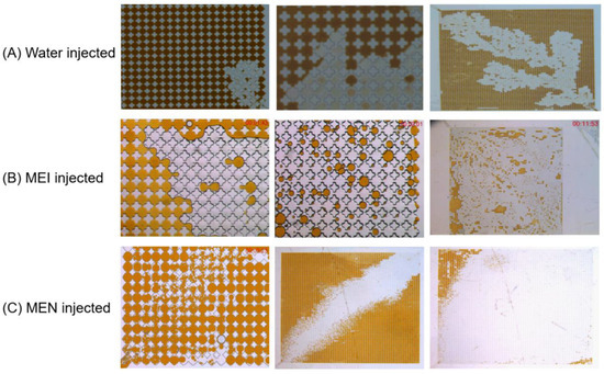 In addition, the IFT equilibrium curve of MEN at different concentrations (0.1 wt%, 0.3% wt%, and 0.5% wt) is plotted in Figure 6. When concentration increased from 0.1 wt% to 0.3 wt%, the IFT reduction effect became more significant. When concentration was raised to 0.5 wt%, there was no apparent change. According to previous researches, the CMC of those chemicals is typically in the range of 0.3–0.5 wt%. The IFT curves shows MEN achieved IFT equilibrium in a short period of time (<10 min), which is a profit, meaning that once the two phases come in contact, chemicals can quickly interact with crude oil.