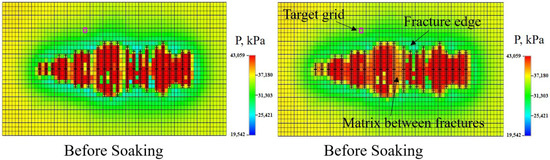 The effect of soaking well (shut-in) was also considered using the model. Soaking is a typical operation usually conducted by operators in the shale oil and gas industry. The benefits of soaking are still under discussion [53], and some researchers are skeptical about leaving fracturing water in the well to improve performance. This study simulated the effect of soaking on pressure field. During the period of soaking, high pressure caused by the fracturing reformation gradually propagated to the matrix between fractures and the fracture edges. As a result, the pressure at the matrix between the fractures increased by 2.5 MPa and the area near the fracture edges increased by 1.1 MPa. The target grid, shown in Figure 15, represents the zone that is far away from fractures. The pressure of the target grid decreased by 0.15 MPa. This indicates that soaking is beneficial for recovering the crude oil in the matrix near fracture/wellbore area, while resulting in pressure loss in areas far away from fractures. Therefore, the soaking time cannot be long; otherwise, the oil in the matrix away from fractures can merely be recovered.