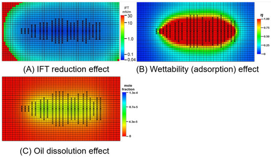 The transformation effect on the reservoir of different oil-increasing mechanisms was studied using the numerical model. As previous researches reported, major mechanisms of chemical EOR are IFT reduction, wettability alteration, and oil dissolution. After injection of the micro-emulsion MEN, the distribution of IFT, the adsorption rate, and the mole fraction of oil in the aqueous phase are mapped in the fracture model. The results in Figure 16 show that the IFT of the largest area is below 0.1%. This is because IFT can be reduced to a low level with low concentrations of chemicals. The boundary of the IFT reduction effect can be recognized as the front of the micro-emulsion spread area. The wettability effect is defined by the adsorption rate. Only in the area close to the fractures, the adsorption rate exceeded the critical adsorption where oil-wetting is altered to water-wetting. In the zone away from the fractures, adsorption of chemicals is lower and wettability of the area is still oil-wet. Oil dissolution by micro-emulsion happens in the matrix between the fractures. Based on the distance of influence zone, this study suggests that the micro-emulsion increases oil by dissolving the oil in the matrix between the fractures, altering wettability in the matrix around the fractures, and reducing IFT in the whole area where fluids spread.