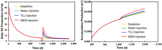 Oil production that can be increased by injection of chemicals and a huff-n-puff operation was predicted by the numerical model. The modeling results are shown in Figure 17. The oil well had been producing by depletion for 1200 days before fluid injection. After the fluid was injected, a time period of soaking was carried out. Daily oil production increased significantly after injection and soaking. During the huff-n-puff stage, the average daily oil production of water, TCJ, and MEN injection is 6.59 m3, 7.73 m3, and 10.54 m3, respectively. Compared to depleted production, injection of water, TCJ, and MEN increased the daily oil production by 49.43%, 75.28%, and 139%. Accumulated oil production was increased by 1.26%, 3.06%, and 8.74%, respectively.