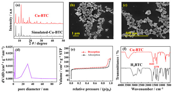 (a) XRD pattern of simulated and prepared Cu-BTC. (b,c) SEM images of nano-Cu-BTC. (d) Pore size distribution of nano-Cu-BTC. (e) N2 adsorption–desorption isotherms of nano-Cu-BTC. (f) FT-IR spectra of H3BTC and Cu-BTC.