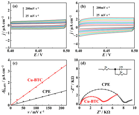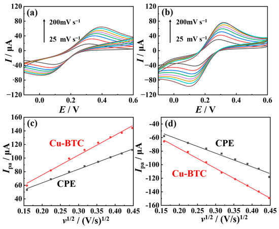 where Ipa represents the oxidation peak current value, A is the electrochemical response area of the electrode, D is the diffusion coefficient, n and are the number of transferred electrons and the initial concentration of K3[Fe(CN)6], respectively, and v is the CV scan rate. In a 0.1 M KCl solution containing 5.0 mM K3[Fe(CN)6], CVs of different electrode surfaces were recorded at various scan rates (Figure 2a,b). Subsequently, the Ipa was plotted against the square root of the v, as shown in Figure 2c, and the slope of Ipa vs. v1/2 was used to calculate the electrochemical active area of different electrodes, which were determined to be 0.0253 cm2 (CPE) and 0.0323 cm2 (Cu-BTC). From the results, it is inferred that the introduction of nano-Cu-BTC can enhance the electrochemical active area of the electrode.