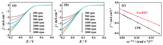 Linear sweep voltammograms of both CPE and nano-Cu-BTC were measured using a rotating disk electrode in a 0.1 M KCl solution containing 5 mM K3[Fe(CN)6], as shown in Figure 3a,b. The electron transfer rate constants were calculated based on the Koutecky–Levich equation [37]: