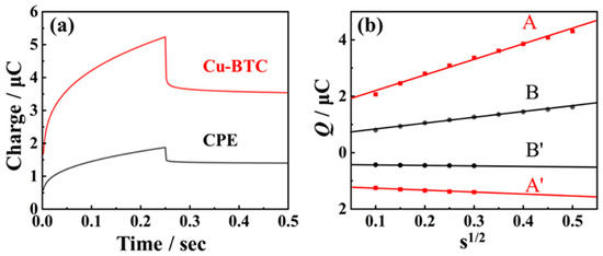 To comprehensively elucidate the sensitization mechanism of nano-Cu-BTC, we employed a double-step chronoamperometry technique to investigate the electrochemical adsorption capability of nano-Cu-BTC. Within the potential range of 0.3–0.9 V, the charge-time (Q-t) curves for the forward adsorption (Qf)/reverse desorption (Qr) on both the CPE and nano-Cu-BTC surface were recorded in a phosphate buffer solution at pH 7.0 containing 10 μM TSC (Figure 5a). According to the Cottrell theory [40], the value of the total adsorbed charge Qads on different electrode surfaces can be calculated.