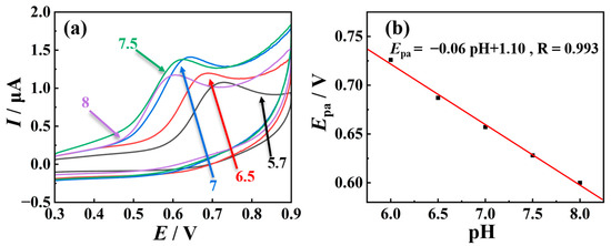 Further research on the signal amplification mechanism in electrode materials becomes feasible by enhancing the TSC interface oxidation process, which further makes it easier to study the interface reaction processes in TSC. Initially, the oxidation behavior of TSC on nano-Cu-BTC was compared using CV in phosphate buffer solutions with varying pH values. As depicted in Figure 6, the oxidation peak potential of TSC exhibits a progressive leftward shift with increasing pH, indicative of proton involvement in the oxidation process. Moreover, the slope of the Epa versus pH curve approximates −0.06 V/pH, reminiscent of the Nernst equation, suggesting an equimolar participation of protons and electrons in the oxidation reaction of TSC. Furthermore, it is observed that as the pH ascends from 5.7 to 7, the oxidation peak current of TSC demonstrates a gradual augmentation. However, upon further increase in pH from 7 to 8, the oxidation peak current commences a gradual decline. Consequently, the oxidation signal of TSC attains its maximum at pH = 7.