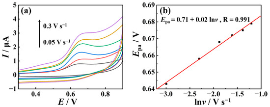 The electrochemical behavior of TSC on nano-Cu-BTC was investigated using CV at various scan rates (v = 50, 100, 150, 200, 250, and 300 mV s−1). As illustrated in Figure 7, with an increasing scan rate, the oxidation peak potential (Epa) of TSC gradually shifts towards the positive direction, indicating the irreversibility of the oxidation process of TSC. In addition, Epa is directly proportional to the logarithm of the scanning rate (v), with a linear equation of Epa = 0.71 + 0.02 lnv; the regression coefficient (R) is 0.991.