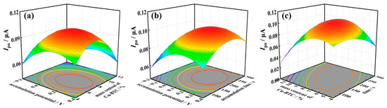Based on the experimental findings presented in Table 1, the optimal detection conditions were determined through software fitting. As shown in Figure 8, the optimal conditions are enrichment time: 224.78 s; enrichment potential: 0.2077 V; and modifier amount: 8.19%. Moreover, the p-values < 0.05 confirm the reliability of the model. Considering the specific experimental operating conditions, the determined parameters are set as follows: enrichment time: 225 s, enrichment potential: 0.2 V, and modifier amount: 8%. The peak current of TSC oxidation measured under these conditions shows no significant difference from the values obtained under the preset optimized conditions provided by the software, indicating the feasibility of the TSC detection parameters used.