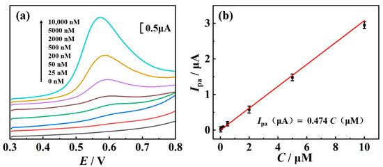 Subsequently, under the optimal conditions obtained through response surface optimization, the relationship between concentrations (C) of TSC and its oxidation signal was investigated. As shown in Figure 9, the oxidation peak current (Ipa) of TSC increased linearly with C of TSC in the range of 25 nM to 10,000 nM, with a linear regression equation of Ipa (μA) = 0.474 C (μM) and a correlation coefficient (R) of 0.992, indicating excellent linearity. The detection limit was 25 nM, which is comparable to the values reported in Table S1.