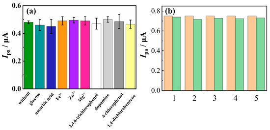 Furthermore, the anti-interference capability of the electrochemical sensor was investigated, and the effects of several common interferents on TSC detection were studied. According to Figure 10a, the glucose and ascorbic acid at 0.025 mM, as well as Fe3+, Zn2+, and Mg2+ at 0.05 mM, 2,4,6-trichlorophenol at 0.02 mM, dopamine at 0.02 mM, 4-chlorophenol at 0.01 mM, and 1,4-dichlorobenzene at 0.01 mM did not interfere with the detection of 1 μM TSC (peak current change less than 5%). To further investigate the anti-interference capability of nano-Cu-BTC in complex samples, tests were conducted in the presence of various interfering substances. The DPV curves showed that nano-Cu-BTC still exhibited good anti-interference capability even with the coexistence of multiple interfering substances (Figure S1, Electronic Supplementary Materials). Stability and repeatability are also important factors for evaluating the analytical performance of the obtained sensor. Five nano-Cu-BTC modified electrodes were used to measure the Ipa of 1.5 µM TSC in 0.1 M phosphate buffer solution (pH 7.0), and after being placed in ambient air at room temperature for 7 days, another set of five modified electrodes were prepared to measure the Ipa of 1.5 µM TSC in 0.1 M phosphate buffer solution (pH 7.0). The experimental results showed that the RSD of the oxidation current values obtained from five parallel running experiments were less than 5%. Furthermore, while comparing the current values obtained seven days previous to the deployment with the current values measured after a week, it was observed that the change in current was less than 5% (Figure 10b). This suggests that the electrochemical sensor exhibits excellent stability and repeatability.