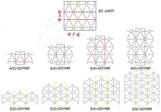 Structural diagrams of γ-A(n)GDYNRs and γ-Z(n)GDYNRs studied in this work. Where n represents the index of nanoribbon width, n = 2~5.