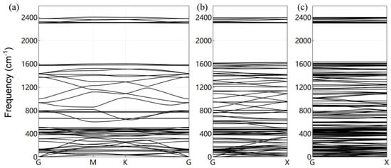 In Figure 2, the phonon spectra of quasi-two-dimensional γ-GDY, γ-A(n)GDYNRs, and γ-Z(n)GDYNRs are described, respectively. Compared to graphene, two-dimensional γ-GDY has a lower phonon branch (<300 cm−1) and introduces some new optical branches at around 2300 cm−1. The optical branch between 200~1500 cm−1 is quite flat. The phonon spectrum of γ-GDY calculated in this manuscript confirms the observation of two acoustic branches at 1400 cm−1 and 2316 cm−1.