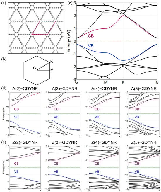 (a) Structure diagram of γ-GDY (the red box represents the unit cell of the structure). (b) The first Brillouin region of the unit cell in γ-GDY, with high symmetry points (G, M, K, G). (c) Electron band structure of γ-GDY (black line, red line (CB), blue line (VB)). (d) Electron band structure of γ-A(n)GDYNRs (n = 2~5). (e) Electron band structure of γ-Z(n)GDYNRs (n = 2~5).