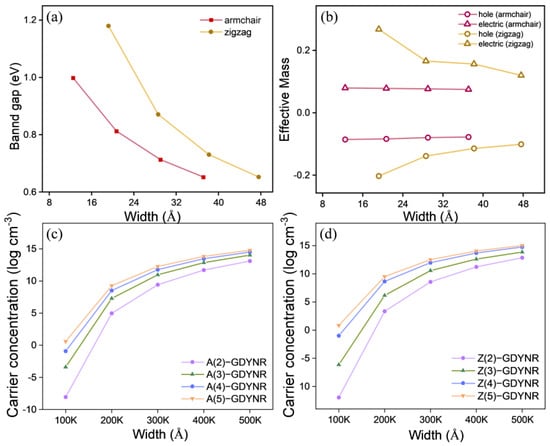 In Figure 4a, the bandgap changes in γ-A(n)GDYNRs and γ-Z(n)GDYNRs at different widths (n = 2~5). It can be observed that the bandgaps of γ-A(n)GDYNRs and γ-Z(n)GDYNRs decrease with increasing nanoribbon width. In Figure 4b, the effective masses of γ-A(n)GDYNRs and γ-Z(n)GDYNRs are shown with holes (red) and electrons (yellow) at different widths (n = 2~5). It was found that the effective mass of γ-A(n)GDYNRs electrons (hole) is less than that of γ-Z(n)GDYNRs. Figure 4c,d describes the temperature-dependent carrier concentrations of γ-A(n)GDYNRs and γ-Z(n)GDYNRs with different widths (n = 2~5). It can be observed that, at low temperatures, thermal excitation is usually limited, making it impossible to generate sufficient carrier concentrations by overcoming the bandgap. As the temperature increases, the carrier concentration is amplified, although the rate of amplification slows down. The carrier concentration increases with increasing nanoribbon width. In addition, the carrier concentration of γ-Z(n)GDYNRs is lower than that of γ-A(n)GDYNRs at the same temperature.