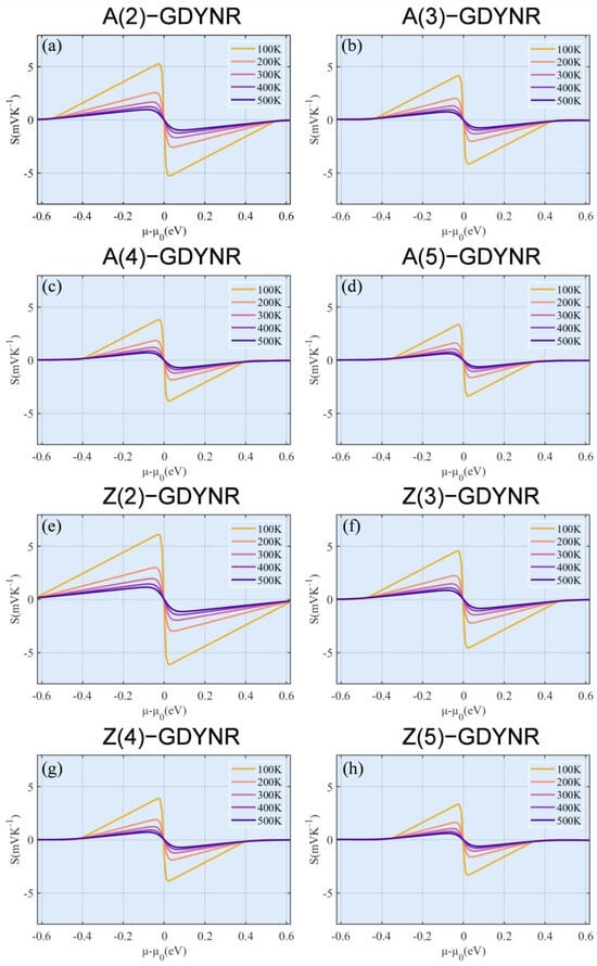 Temperature-dependent Seebeck coefficients as a function of chemical potential for (a) γ-A(2)GDYNRs, (b) γ-A(3)GDYNRs, (c) γ-A(4)GDYNRs, (d) γ-A(5)GDYNRs, (e) γ-Z(2)GDYNRs, (f) γ-Z(3)GDYNRs, (g) γ-Z(4)GDYNRs, (h) γ-Z(5)GDYNRs.