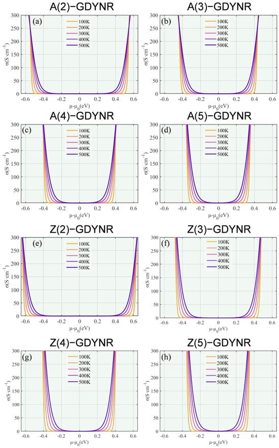 Temperature-dependent electrical conductivity as a function of chemical potential for (a) γ-A(2)GDYNRs, (b) γ-A(3)GDYNRs, (c) γ-A(4)GDYNRs, (d) γ-A(5)GDYNRs, (e) γ-Z(2)GDYNRs, (f) γ-Z(3)GDYNRs, (g) γ-Z(4)GDYNRs, (h) γ-Z(5)GDYNRs.