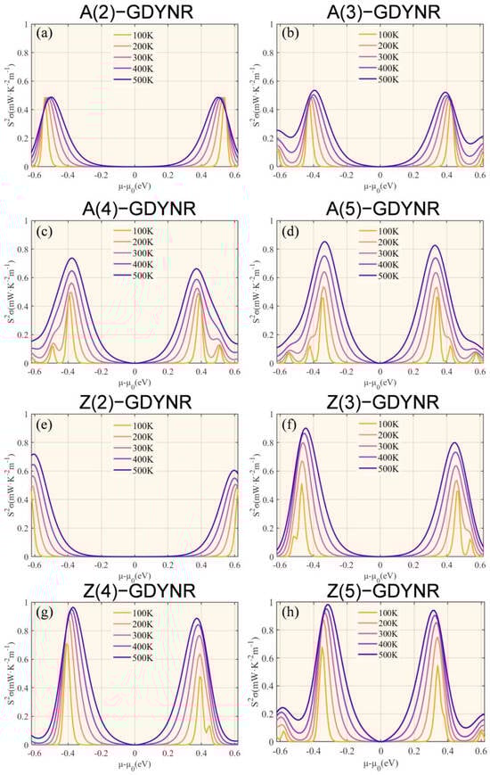 Temperature-dependent power factor (PF) as a function of chemical potential for (a) γ-A(2)GDYNRs, (b) γ-A(3)GDYNRs, (c) γ-A(4)GDYNRs, (d) γ-A(5)GDYNRs, (e) γ-Z(2)GDYNRs, (f) γ-Z(3)GDYNRs, (g) γ-Z(4)GDYNRs, (h) γ-Z(5)GDYNRs.