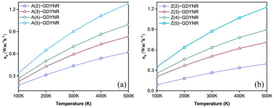 Thermal conductivity comprises electronic and lattice thermal conductivity. It can be seen from Figure S6 and Figure 8 that the thermal conductivity of the γ-GDYNRs is mainly contributed by lattice vibration, that is, phonons. In Figure S6, the temperature-dependent chemical potential function of electronic thermal conductivity for γ-A(n)GDYNRs and γ-Z(n)GDYNRs is shown. According to Formula (5), the electronic thermal conductivity is more sensitive to temperature, relative to electrical conductivity. Moreover, the electronic thermal conductivity of γ-GDYNRs showed an increasing trend with the increase in temperature (Figure S6). At 500 K, the electron thermal conductivity increases with the width of γ-A(n)GDYNRs and γ-Z(n)GDYNRs.